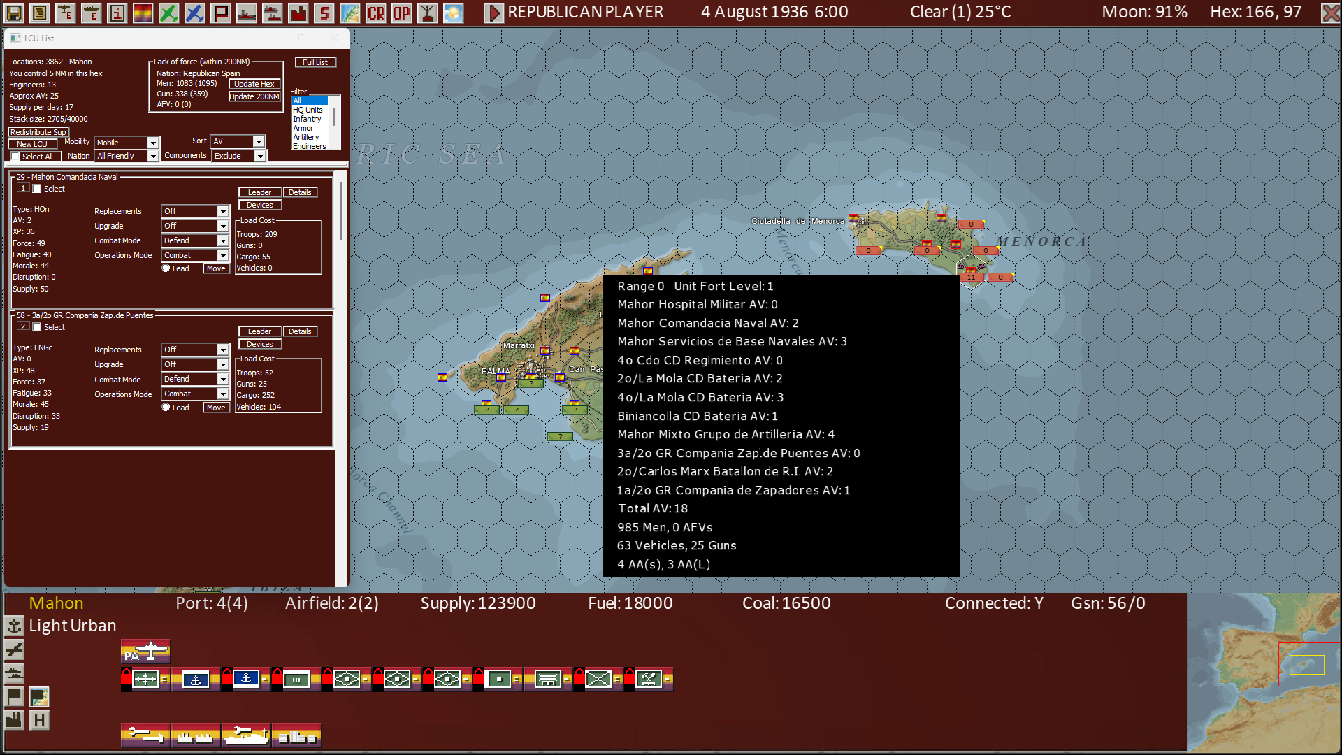 The map scale of 5 nautical miles per hex provides a sense of immersion and interaction rarely encountered in Operational/Strategic Level games. With TO&Es and combat resolution down to the individual vehicle, aircraft, gun and squad level, the game covers the entire Spanish Civil War period at the Division, Brigade, Regiment, Battalion and even Company Level. This includes individual aircraft, ground equipment and ships from Spain, Soviet Union, Germany, Italy and others.