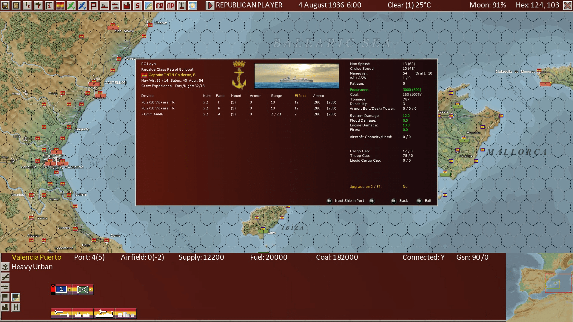 While not on the scale of later WWII naval combat, the naval theater played an important role in the Spanish Civil War. The unparalleled realism in War In Spain 1936-39 has both sides using their merchant fleets to bring in supplies from their supporting countries. A new naval combat board shows the ship locations on the sea as they engage each other in battle. All surface guns, AA guns, ASW weapons are individually represented. Each ship’s crew has an experience rating for day and night combat. Every ship from battleships down to gunboats has a commander with his own strengths and weaknesses. The game includes 100s of ships chosen from dozens of ship classes.